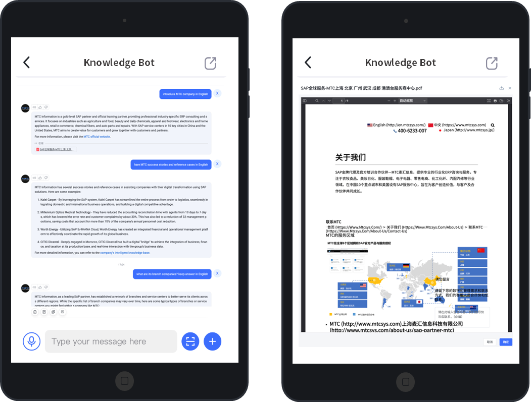 MTC Enterprise Assistantは最先端の人工知能技術に基づき、企業の内部と外部のデータと知識を深く統合し、企業の運営と管理のあらゆる面で広く使用されています。個人化されたインテリジェントなインタラクティブサービスを提供することで、従業員の効率と顧客満足度を効果的に向上させ、企業のインテリジェントなアップグレードと競争力強化を支援します。